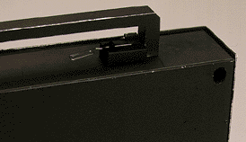 写真に見られるように基本的には「コッキングガンのバレルに弾を一杯込めて撃つ」物です。まあそれが銃そのものの形ではつまらないし、撃たれた敵も納得しませんので、無理矢理四角い箱の中に納めただけです。ベースになった銃は、1号機(左)が東京マルイ製エアコッキング式のMP5。2号機(右)が同じくG3です。ベースの銃(もはや銃とは言え無いぞ・・・)の選択には安価で、ポンプ容量が大きく、持っている人が比較的多い銃と言う事で決定しました。特に3つ目の理由は重大で、要らなくなった人から提供してもらう事で大幅なコストダウンが図れます。 また当然の事ながらバレルはベースの銃からの流用です。シアーを解放させるためのシステムもジャンクパーツのマガジンより拝借しました。エアー流路を曲げるためのL字パイプはエアー給弾式のマガジンに使われている物です。このパイプは買っても安いので購入しても良いでしょう。全体を箱形に見せるための箱は電子用品屋に売っているアルミケースです。このクレイモアの中で一番コストがかかっているのがこの外箱で、¥2000程しました。 |