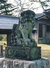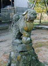 こま犬はもう1対あって,こちらは玉を持ったタイプ。阿形は両足を,吽形は片足を玉にのせている。阿形は顔がなくなってしまっている。吽形もひびが入ったり,かなりボロボロ。海が近いのでしょうがないのか。