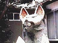 新潟駅近くの住宅街の中にひっそりとある感じの神社。鳥居の前はすでにアパート(?)の駐車場になっている。ここにはキツネはいないのかなーと思ってのぞいたら,個性的な表情のキツネがいた。あいかわらずよく見えないけれど,足もがっしりして,鋭い爪がある。表情をアップで。