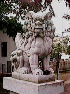 こま犬はだいぶ新しく,色つき。新しいといっても平成元年のもの。平成に入ってからのものというのは,全てが新しいように感じるんだけど,もう平成も9年目。それなりの歴史がでてきているはず。コンピュータなんか,平成元年には一般ピープルがさわるものじゃなかったもんね。