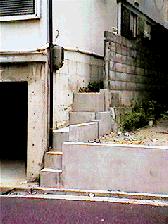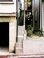 家と家の境にこのような階段のようなものがあったのでした。あー,階段だなと思って一度は通り過ぎたんだけれども,よく見ると階段としては段が不揃いだし,幅も40センチくらいで人ひとりがやっと通れるくらいなのでした。