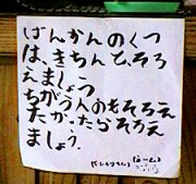 これは実は路上の物件ではなくて,私の家の中なのでした。玄関の下駄箱に貼ってあるハリガミで,作者は私の姪・小学2年生。