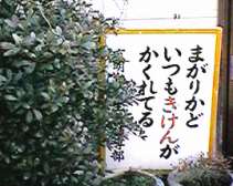 危険が隠れているのであれば,せめてそれを警告するカンバンは堂々と目立つところに立っていてもらいたいものなんだけれども,このカンバンはあくまでもひっそりと控えめに通行者の安否を気遣っているようなのでした。