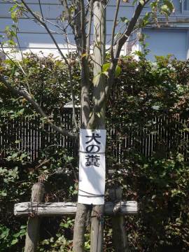 このようなカンバンを掲げられた樹木の気持ちは,いかばかりでありましょうか。もし自分が「犬の糞」と書かれた名札をつけて周囲の視線にさらされて立ち続けるとしたら。ひどい仕打ちであります。